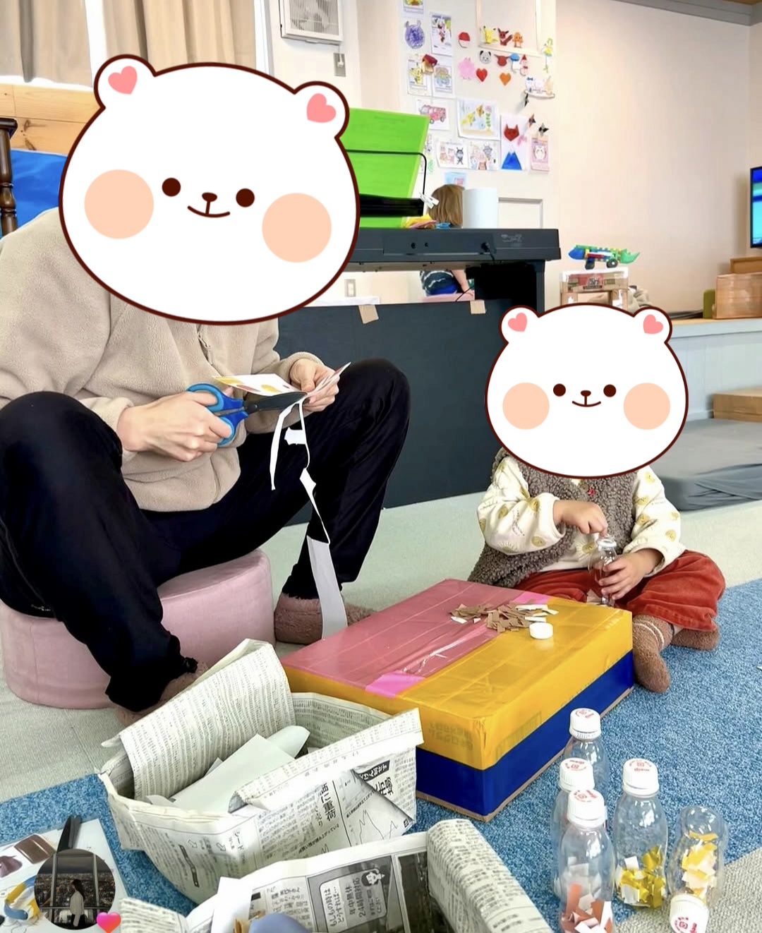 足を広げてるから? ハサミを子どもの近くでやっていて、 子どもから目を離しているから? 椅子に座っているように見えるから? どこですかね🤔? 顔隠してるからいいかなって 感じで確認せずアップしたんですかねぇ‥ 逆にお子さんも顔隠してアップしますの確認はあるんですかねぇ、?