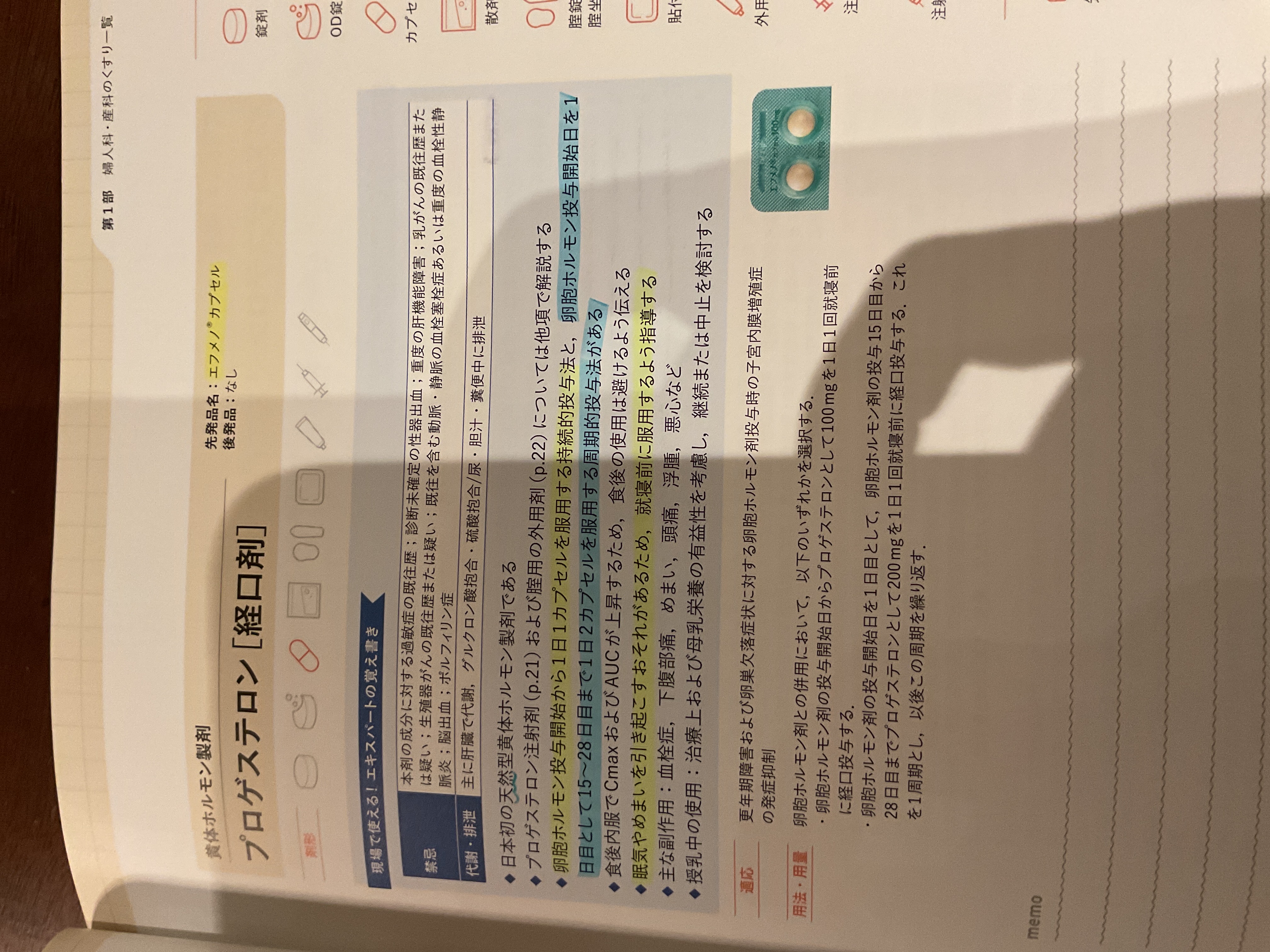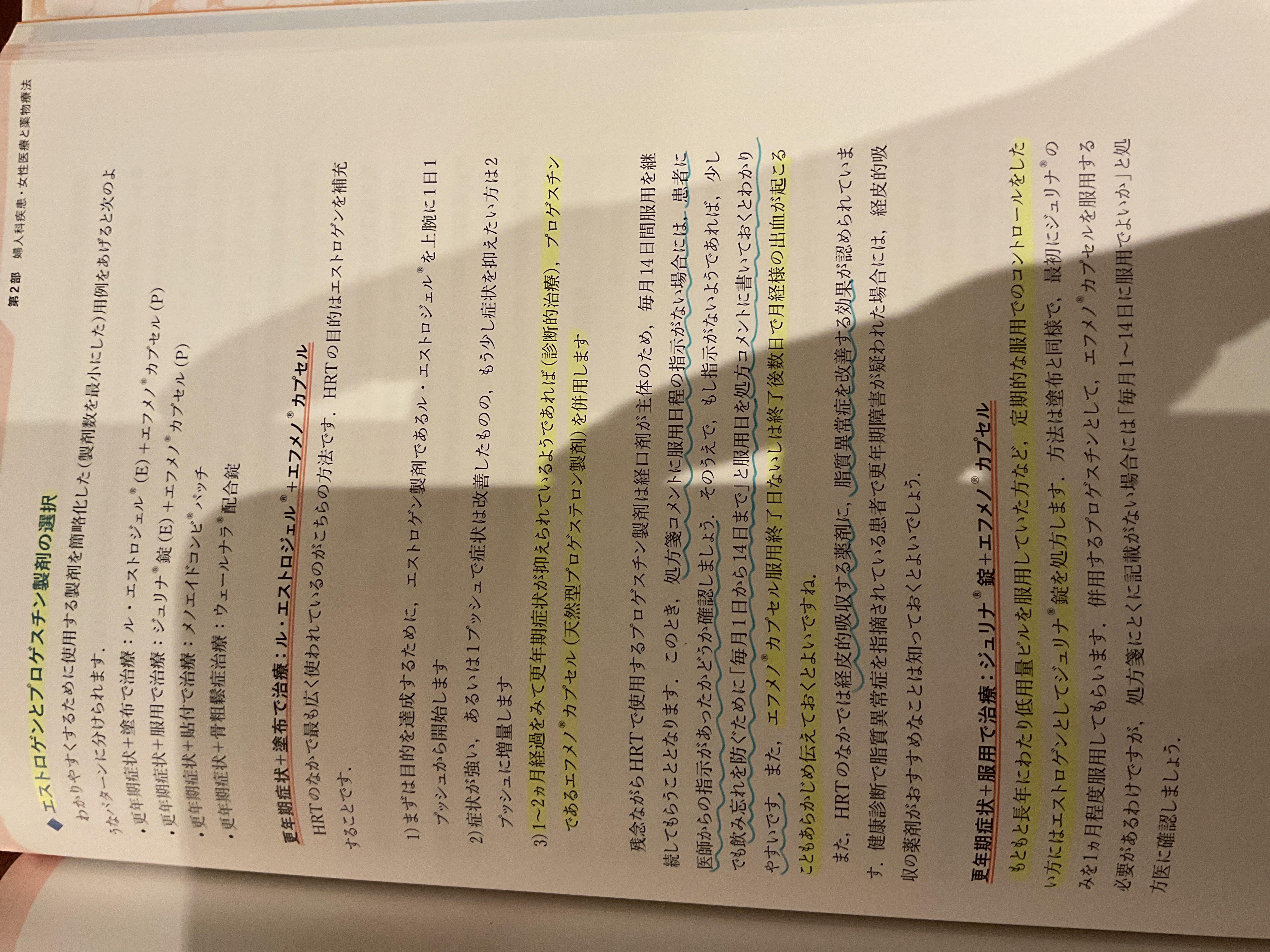 更年期障害の治療に周期的投与法があるとおもいますが、黄体H製剤はいつからいつまで服用するよう指示を出せばいいのでしょうか? 写真であげている参考書には、エフメノカプセルの説明(青マーカー)では「卵胞ホルモン投与開始日を1日目として15~28日」との記載がありますが、他のページには毎月1日〜14日(青線)という記載があり混乱しています 勉強不足で申し訳ありませんが教えて下さい